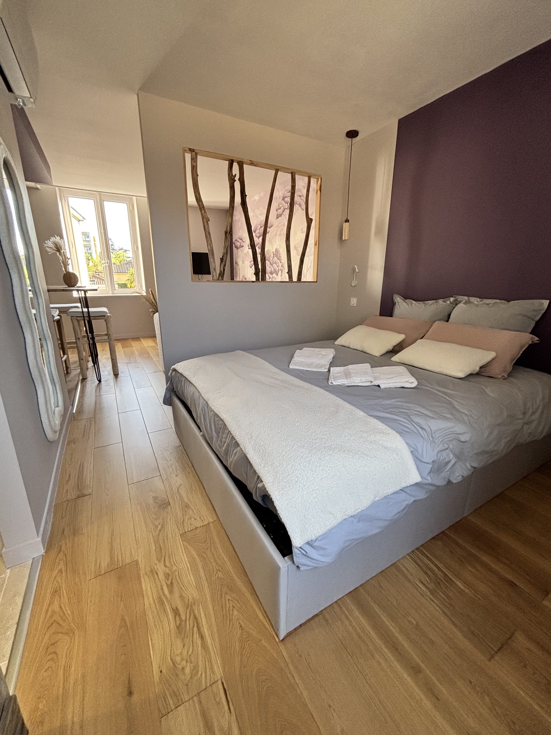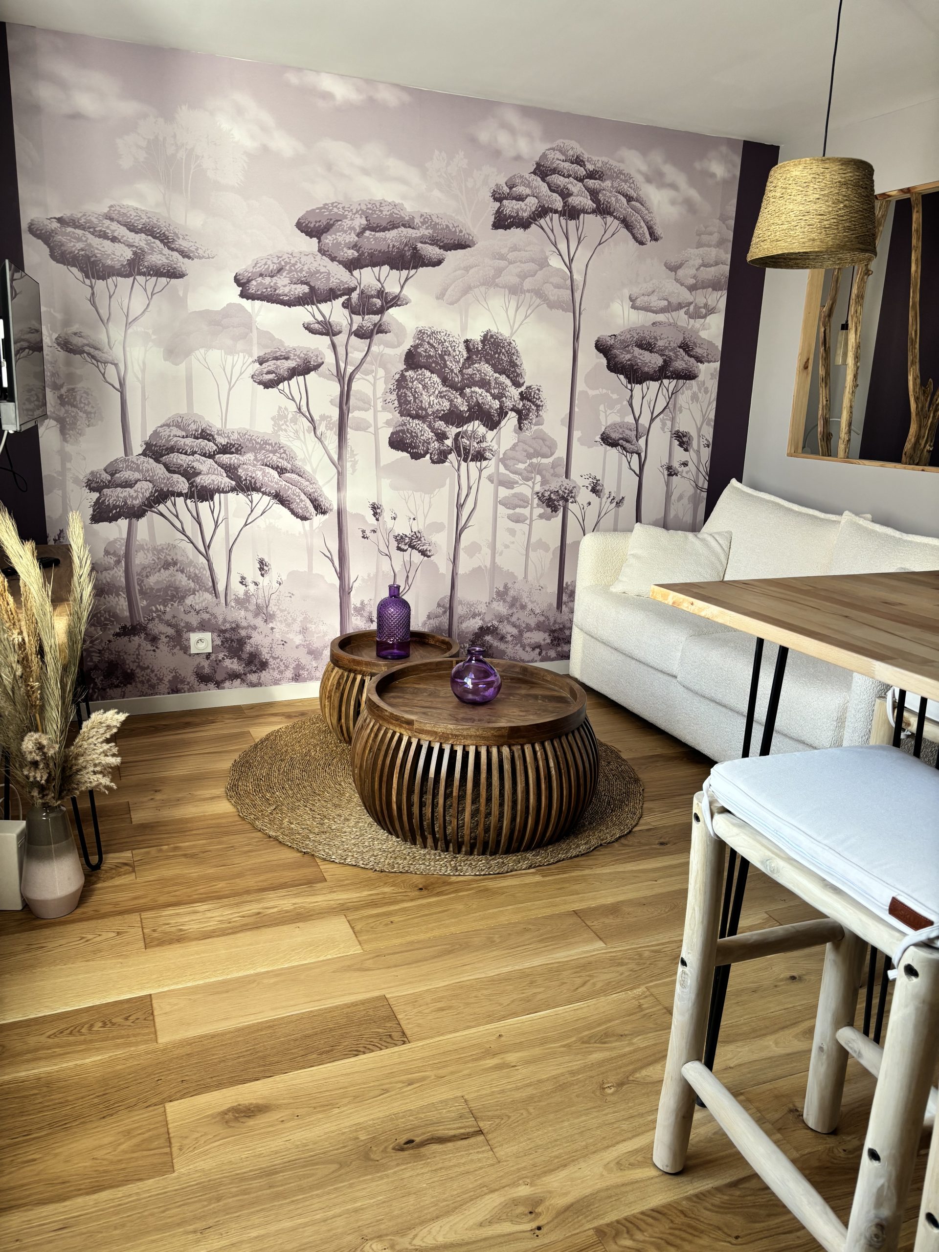 Un univers poétique et enveloppant, où les teintes mauves et violines se marient à la chaleur du bois. La fresque aux arbres majestueux évoque un paysage onirique, comme une forêt baignée de clair de lune. Les formes arrondies des tables et les fibres naturelles accentuent cette atmosphère douce et organique. Entre élégance contemporaine et charme boisé, cette chambre transporte vers une expérience sensorielle unique, à la fois féérique et réconfortante.