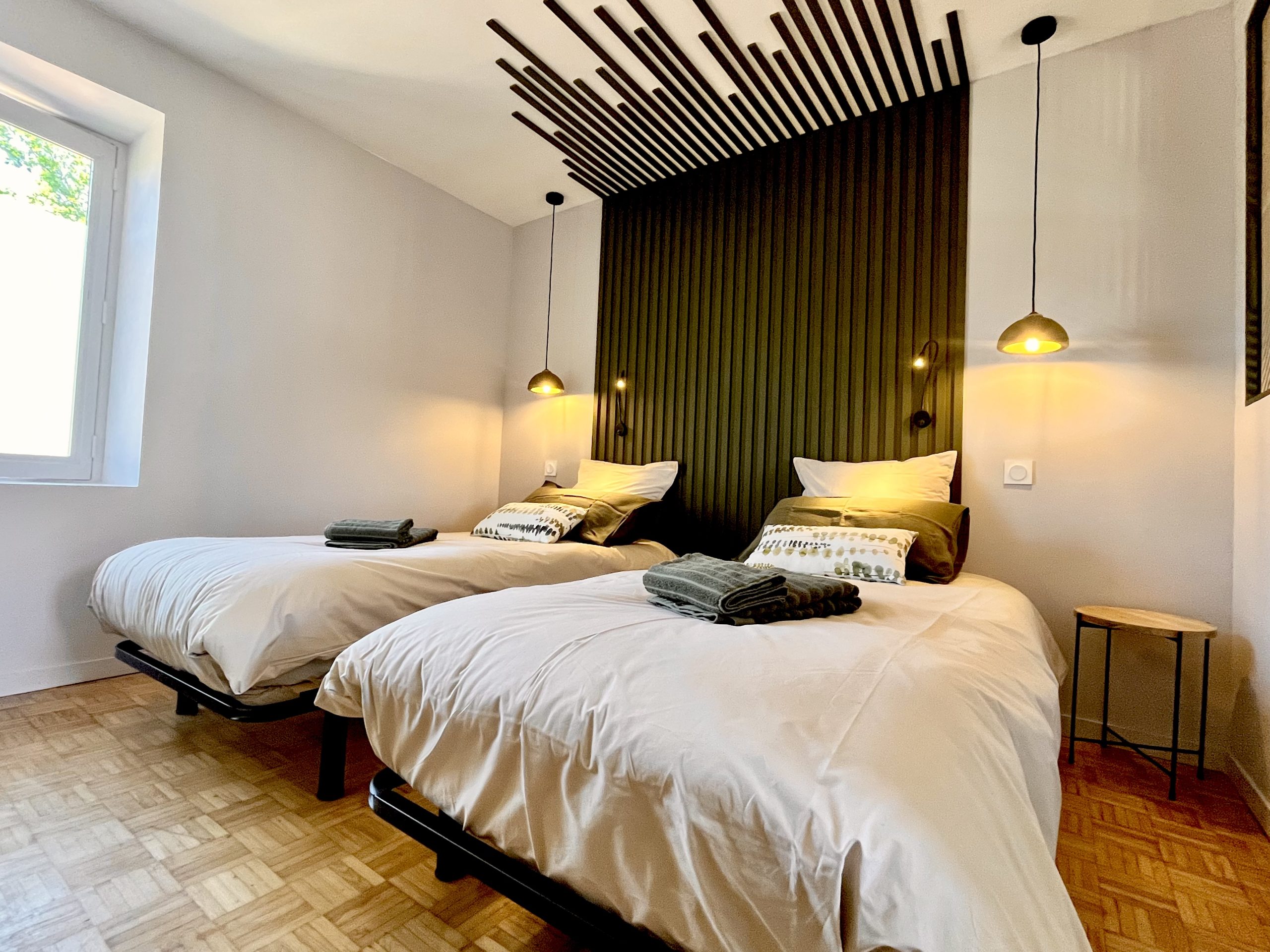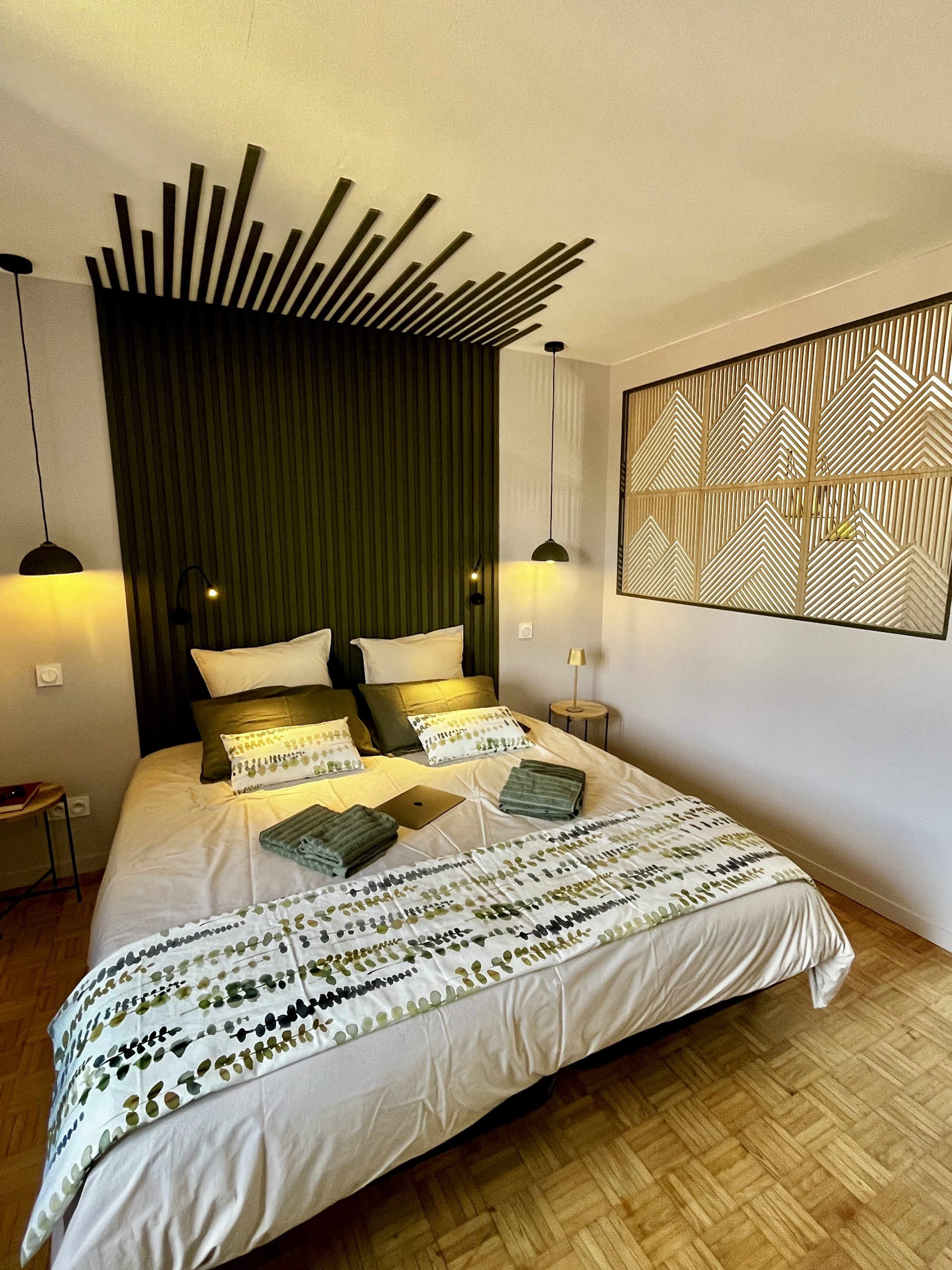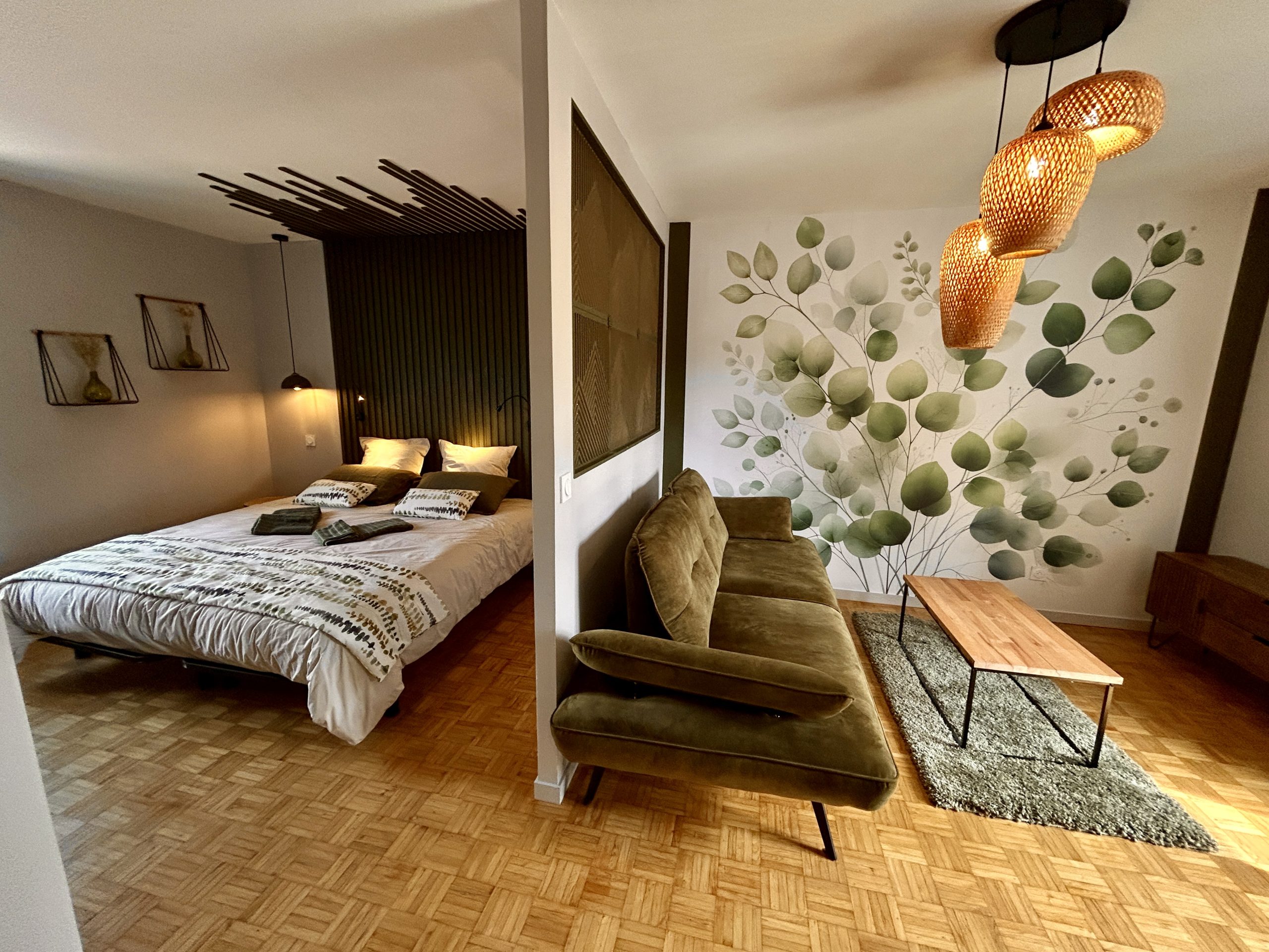 Un cocon naturel et raffiné où le vert profond dialogue avec des touches de bois clair et des motifs végétaux. La fresque murale aux feuilles légères insuffle une atmosphère apaisante, comme une promenade en forêt au petit matin. Les lumières tamisées et les matières chaleureuses, entre velours et fibres tressées, invitent au repos et à la rêverie. Une ambiance douce et ressourçante, parfaite pour une parenthèse hors du temps.
